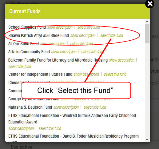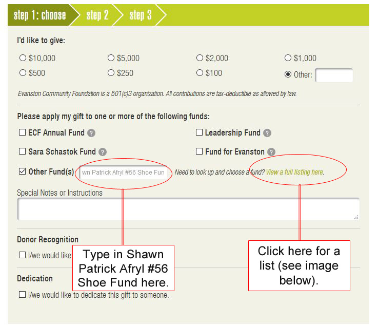 Help Us Give Shoes Once you get to the page..... Click on "Other Funds" and either type in Shawn Patrick Afryl #56 Shoe Fund or click on the "View a full listing here" link to fill it in for you. Like this: Then you'll see this: And then follow the rest of the instructions on that page.